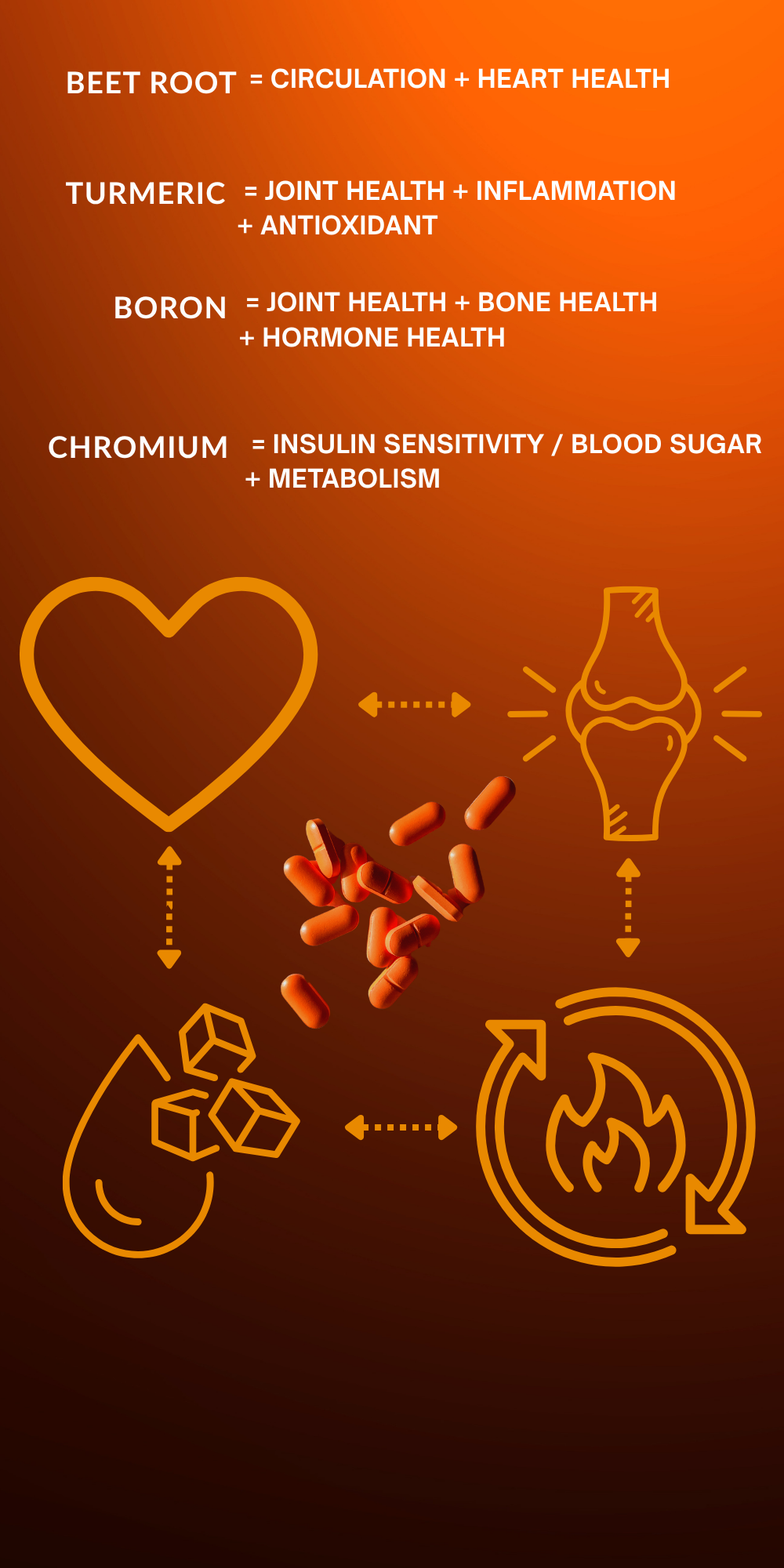 - Beet Root Extract has been shown to support vascular function and exercise performance via increased nitric oxide.